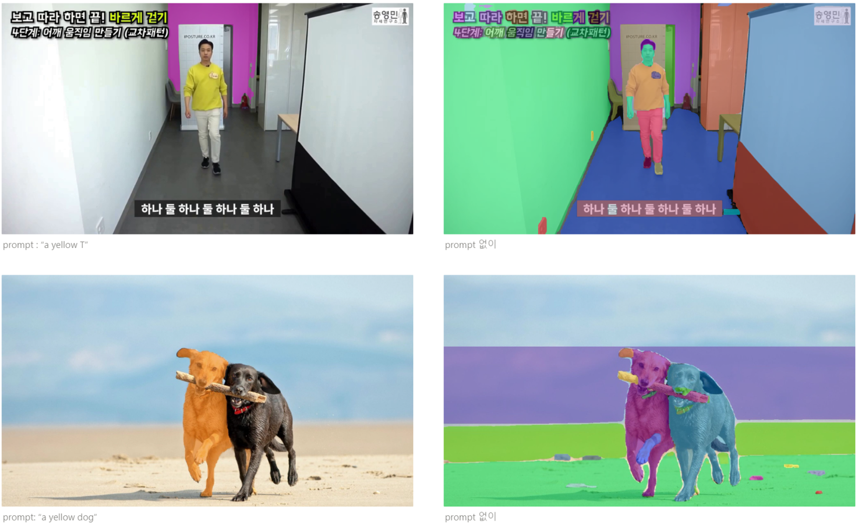 그러나 테스트를 위한 이미지를 넣었을 때 는 prompt 없이 실행 시키면 영역 분할이 되지만, “a yellow T” 같은 노란색의 셔츠를 지정했을 때