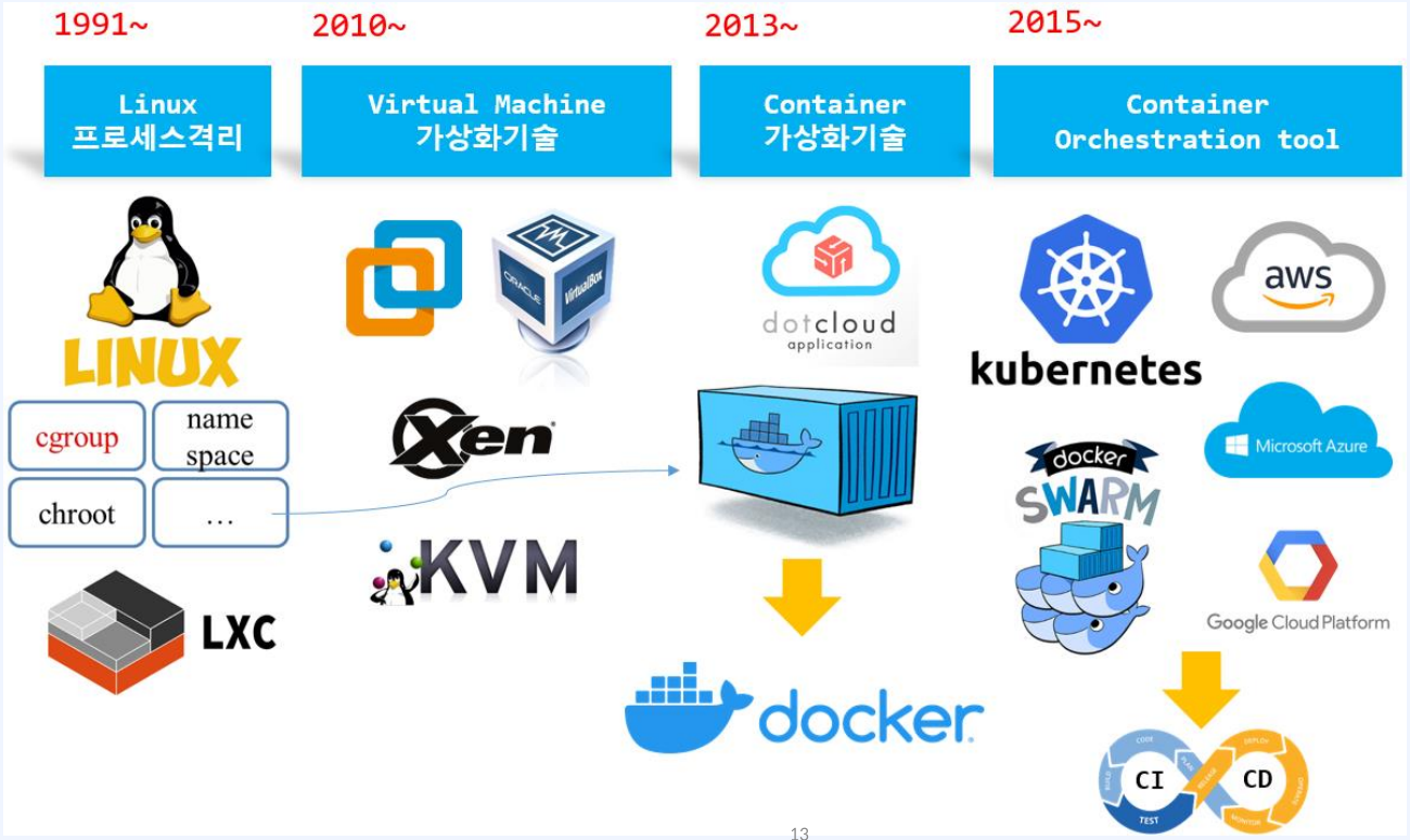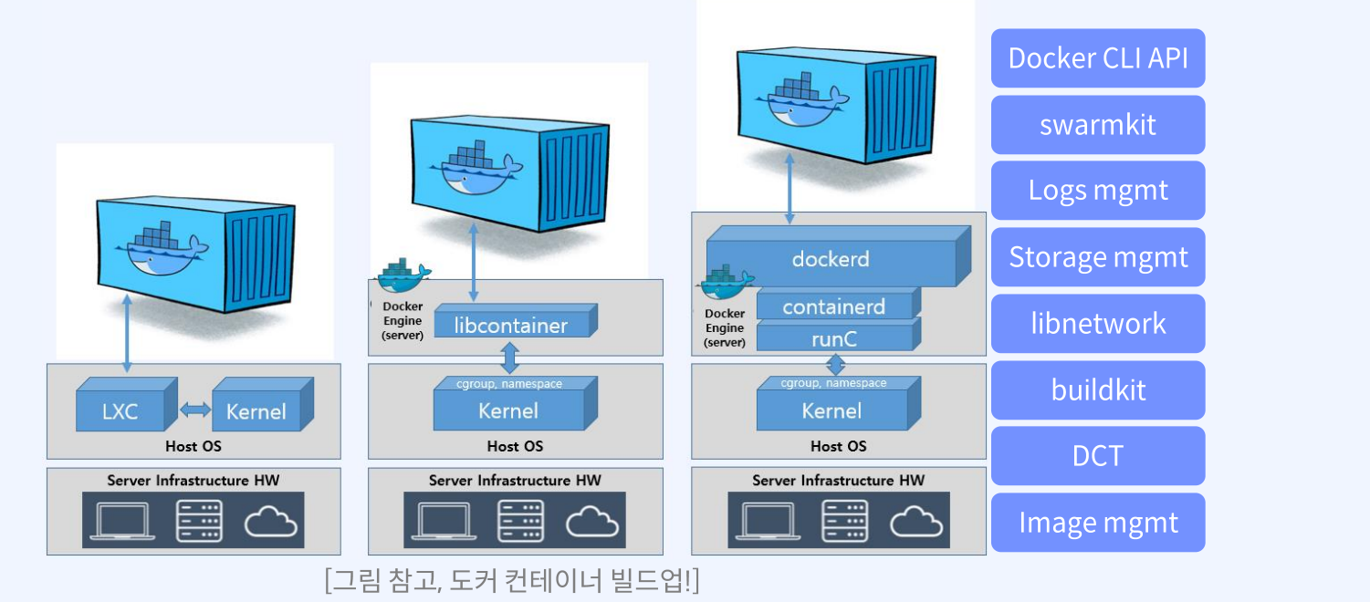 - LXC(LinuX Container): 초기 시스템 컨테이너로 시작.