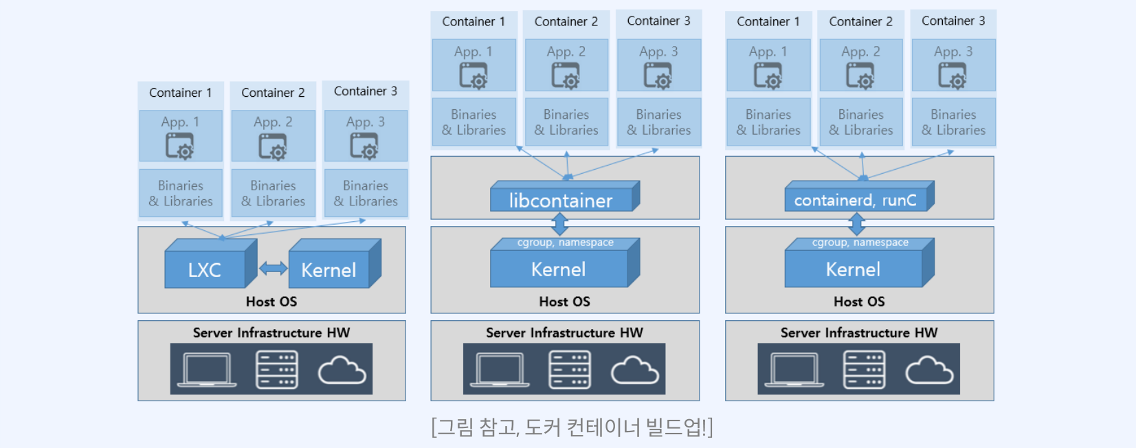 - Docker: 애플리케이션 컨테이너로 발전, containerd와 runC를 사용하여 컨테이너 생성 및 관리.