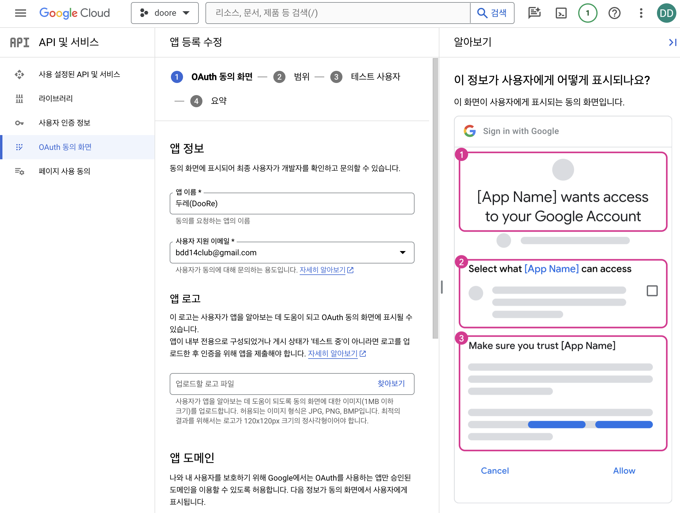 OAuth 2.0을 통해 사용자가 로그인할 때 표시되는 동의 화면을 구성합니다.