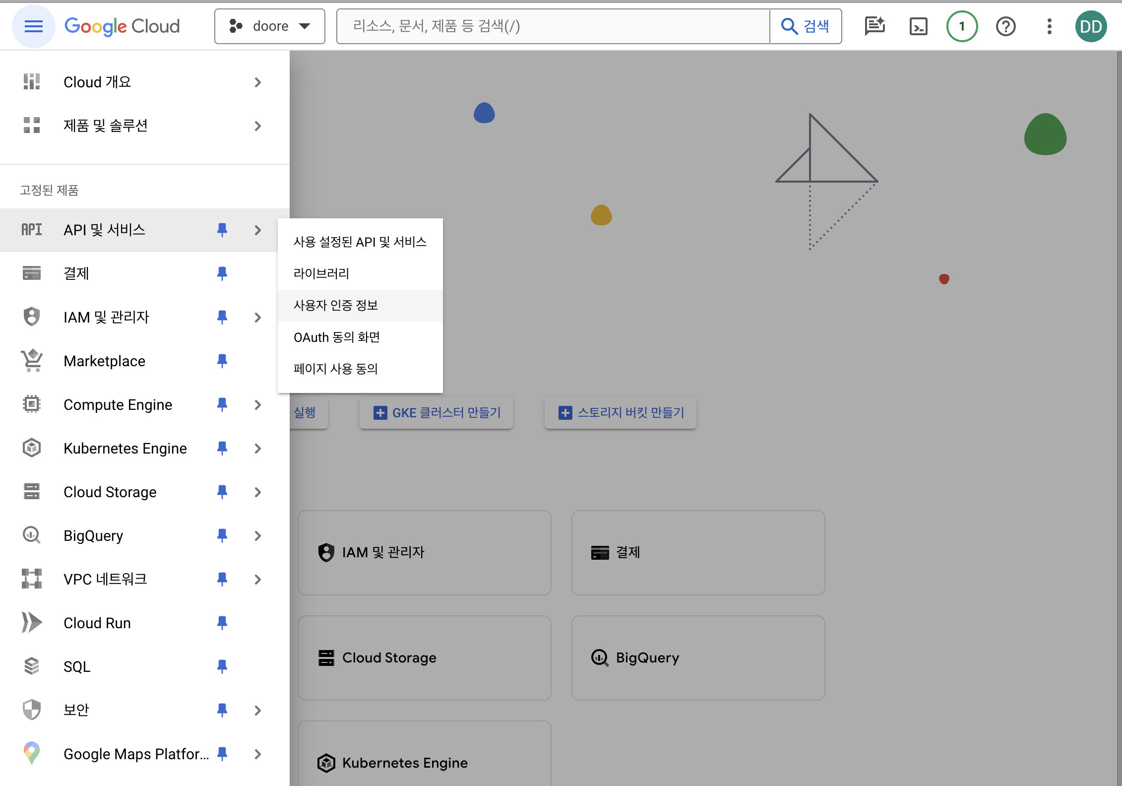 - 사용자 인증 정보 메뉴에서 OAuth 클라이언트 ID 생성