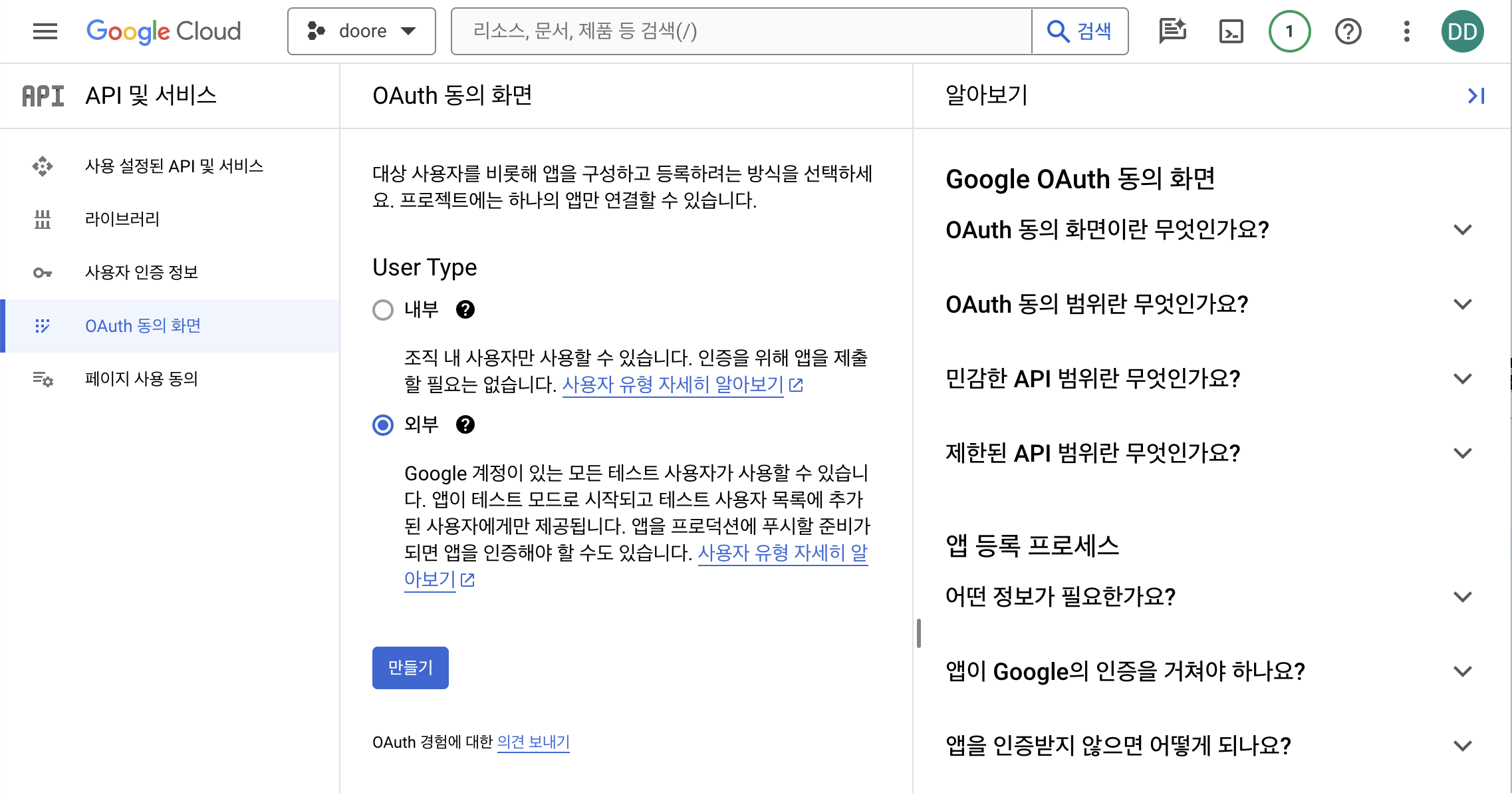 구글 간편 로그인을 구현하기 위해서는 먼저 Google API 콘솔에서 프로젝트를 생성해야 합니다.