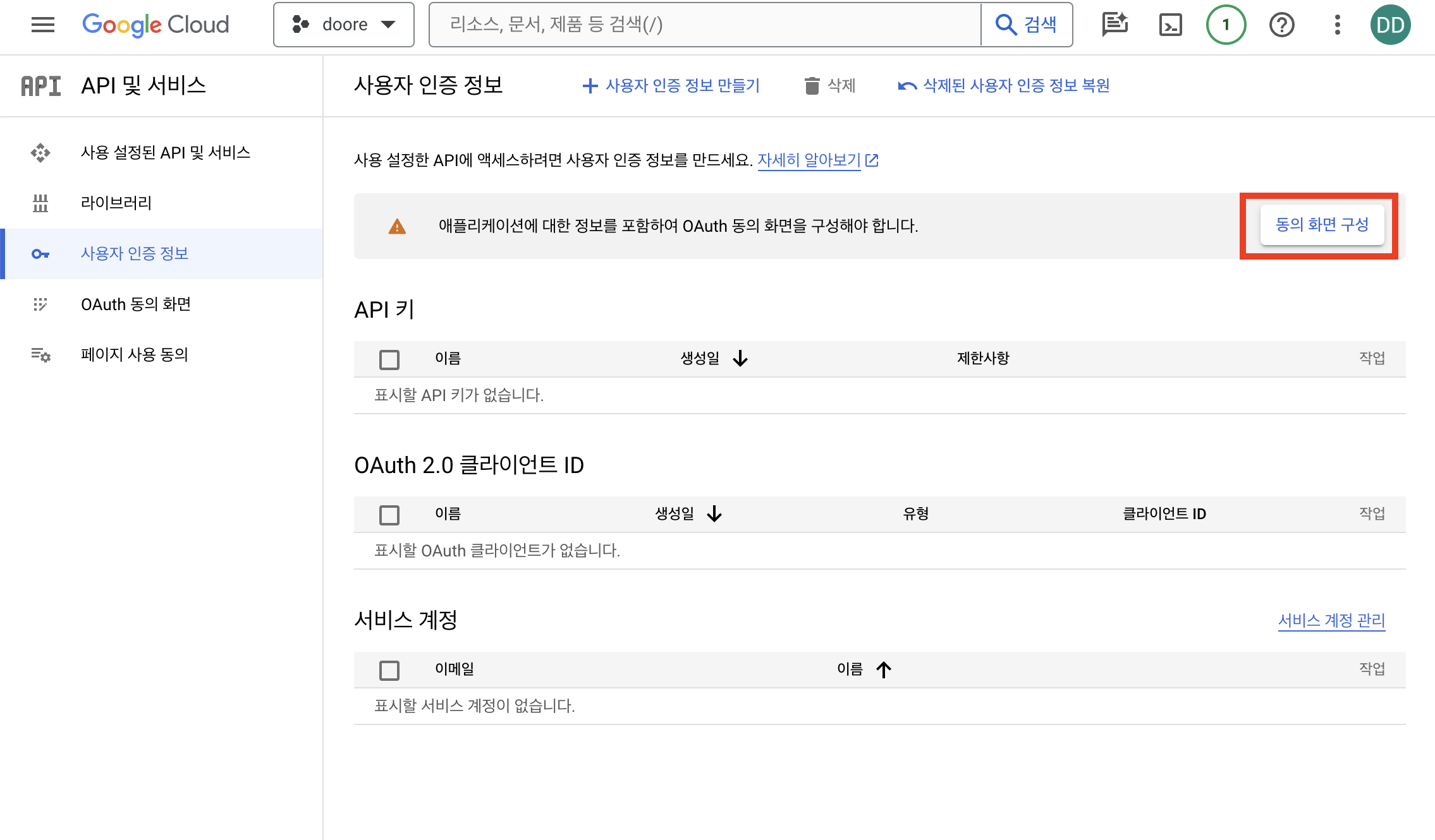 1. 사용자 인증 정보 메뉴에서 동의 화면 구성을 클릭합니다.