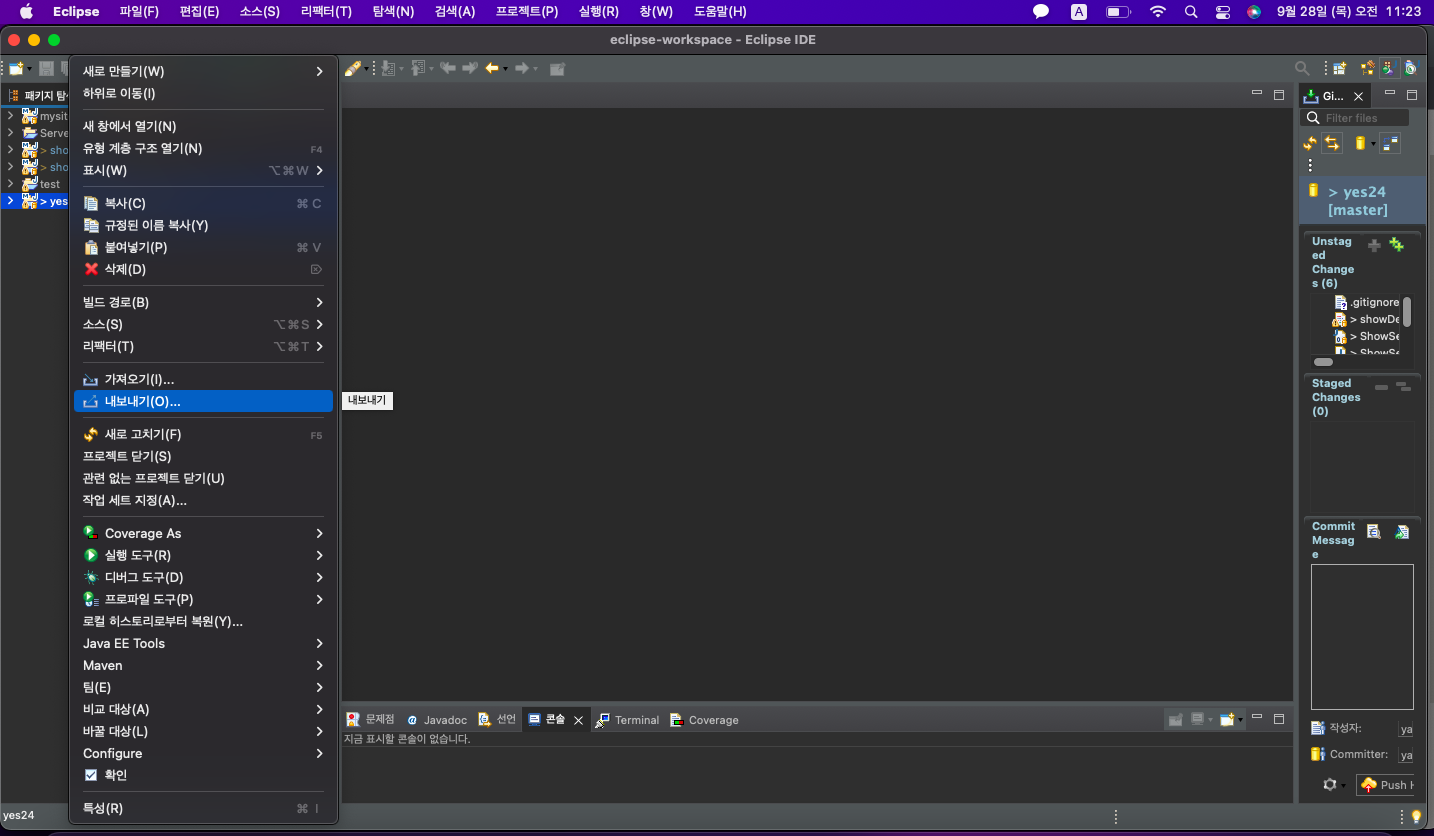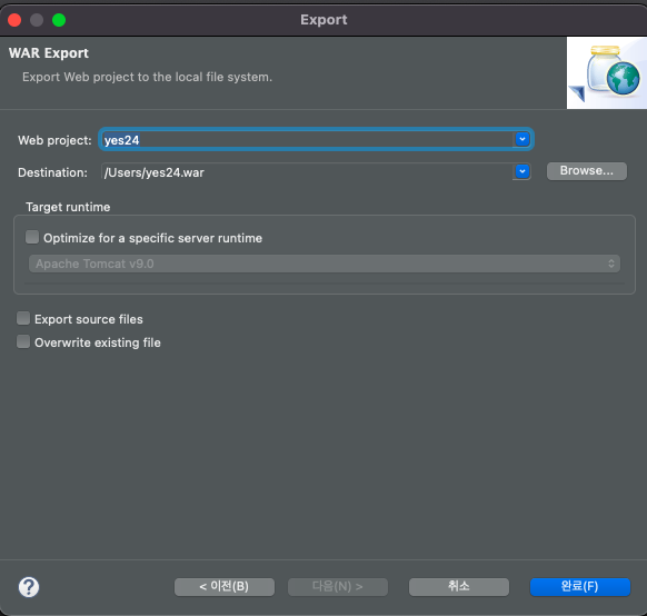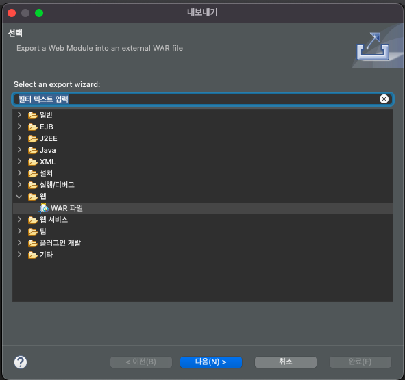 Spring에서 프로젝트를 export 하여 war파일을 생성합니다.