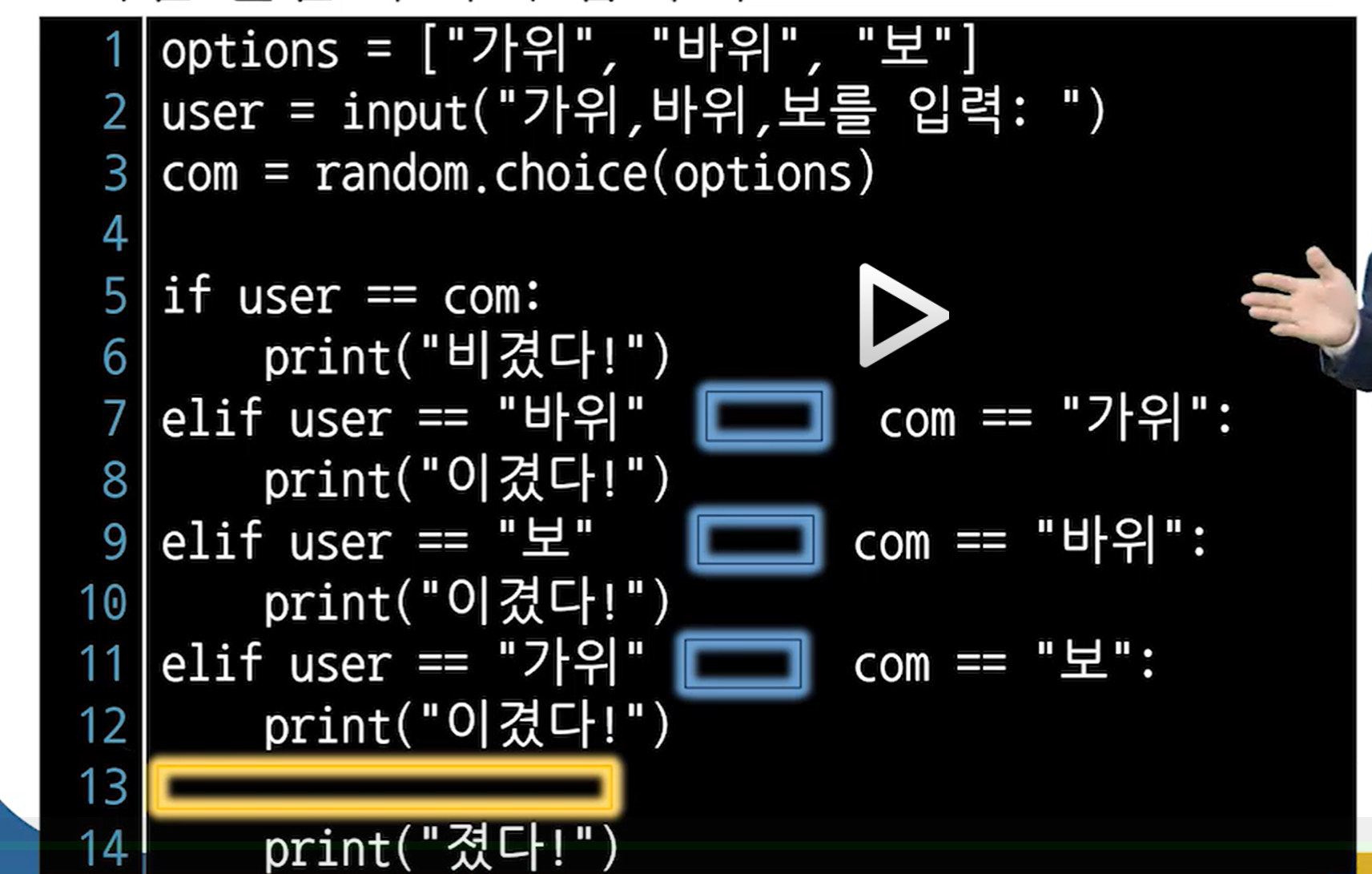 20. 아래는 가위바위보 게임 소스코드의 일부이다. 다음 물음에 따라 답하시오.