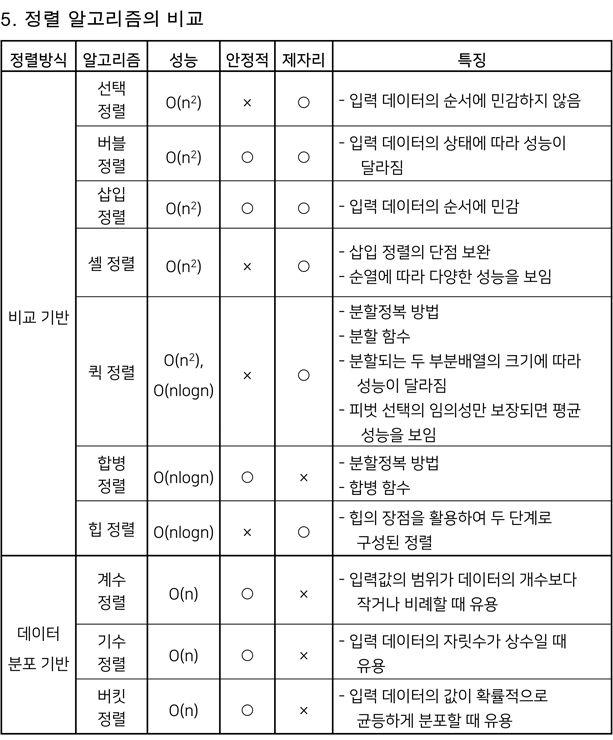 ⦁ 안정적 정렬, 제자리 정렬이 아님 - 5. 정렬 알고리즘의 비교