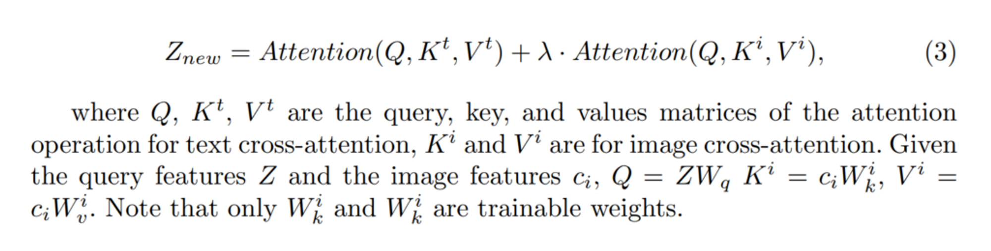 두번째로 face embedding을 비주얼 프롬프트로 사용하기 위한 과정입니다. ID embedding에서 추출한 face embedding과 프롬프트로 입력된 text embedding을 결합하는 decoupled cross attention을 거칩니다. text embedding의 cross attention결과에 face embedding의 cross attention결과를 더해서 query feature(Z_new)를 새로 만드는 것이죠. 식은 다음과 같습니다.