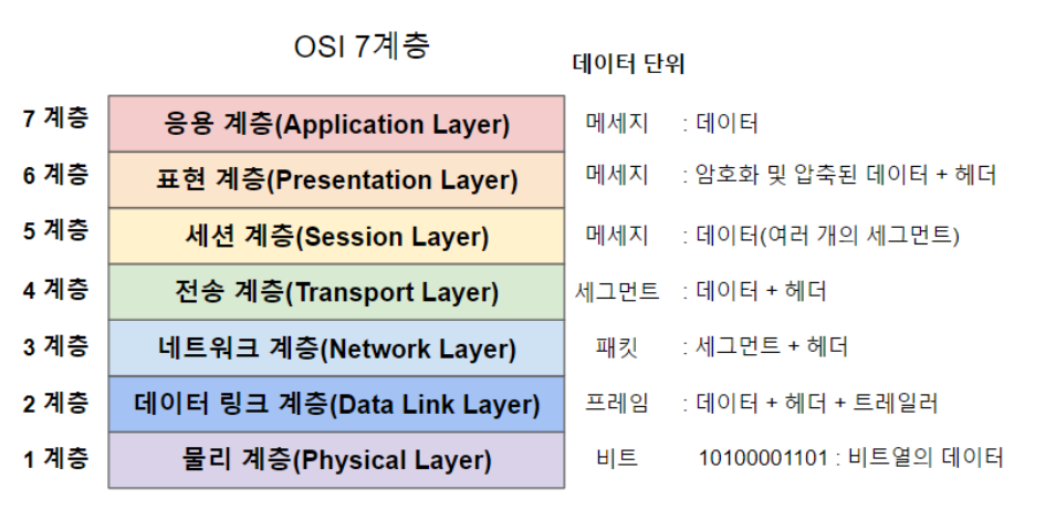 아래 그림에서 아래부터 1계층(물리 계층) ~ 7계층(응용 계층)으로 구성되어 있다.